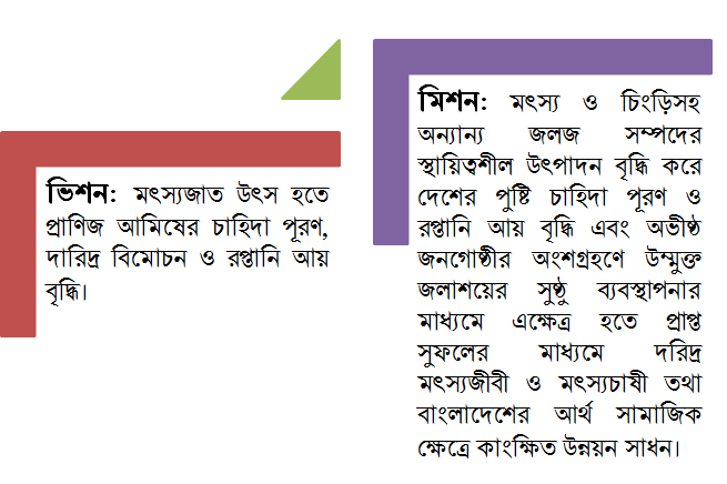 ভিশন: মৎস্যজাত উৎস হতে প্রাণিজ আমিষের চাহিদা পূরণ, দারিদ্র বিমোচন ও রপ্তানি আয় বৃদ্ধি।